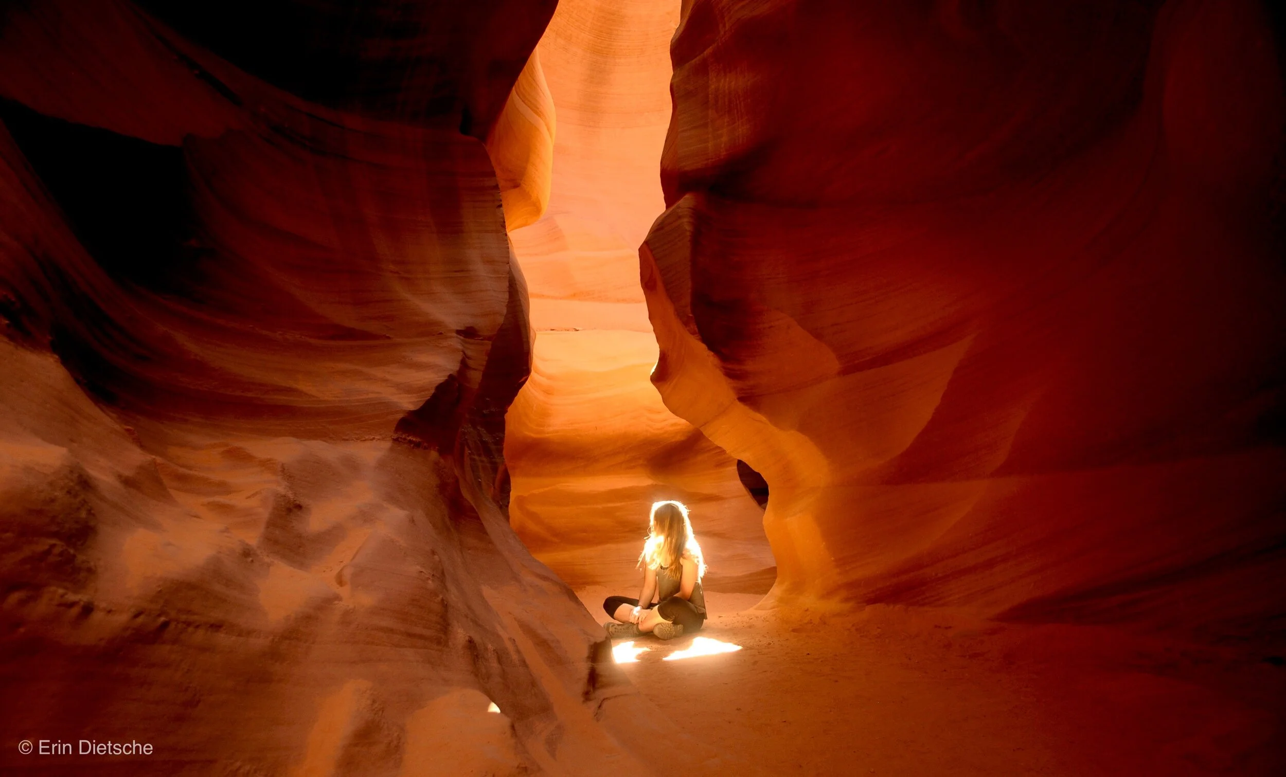Once the highway was cleared, I headed straight up to Page to catch my 11 am tour of Lower Antelope Canyon tour with Kenβs Tours. No words can describe the otherworldly beauty of Antelope Canyon. Approaching the canyon, it just looks like a mere crack in the earth. You wouldnβt suspect that an orange-drenched world was hiding below. Beams of light shone through the sand-dusted air, making the canyon walls glow red.