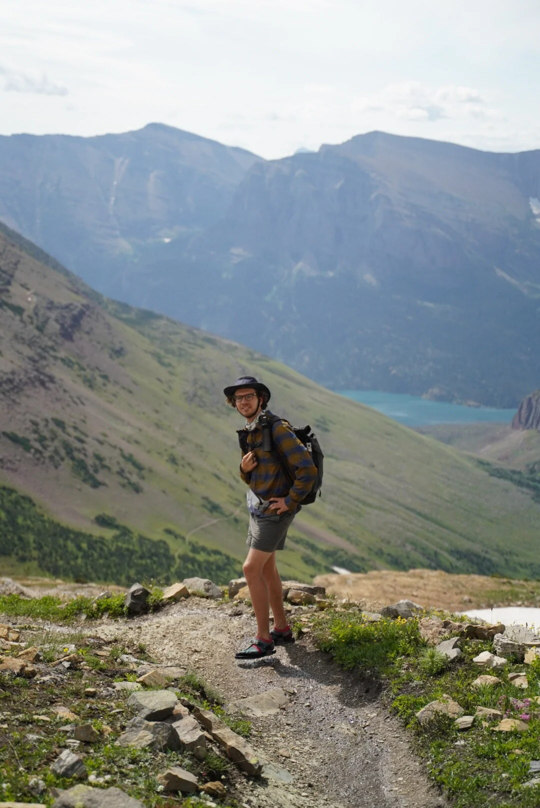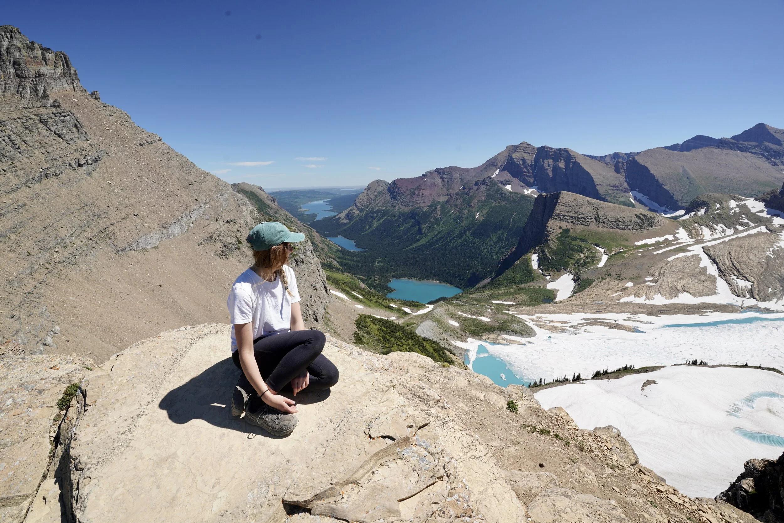 Past this section, the trail provides stunning views of the mountains and continues up over a mountain pass. At about 7 miles in, you'll intersect with the Garden Wall Trail, which you will take to get to Grinnell Glacier Overlook. This last section of the trail was the hardest for us because it was super steep. In less than a mile, you ascend over 900 feet. The view from the top is 100% worth it. From the overlook, you look down on the beautiful Grinnell Glacier and a string of glacial lakes.