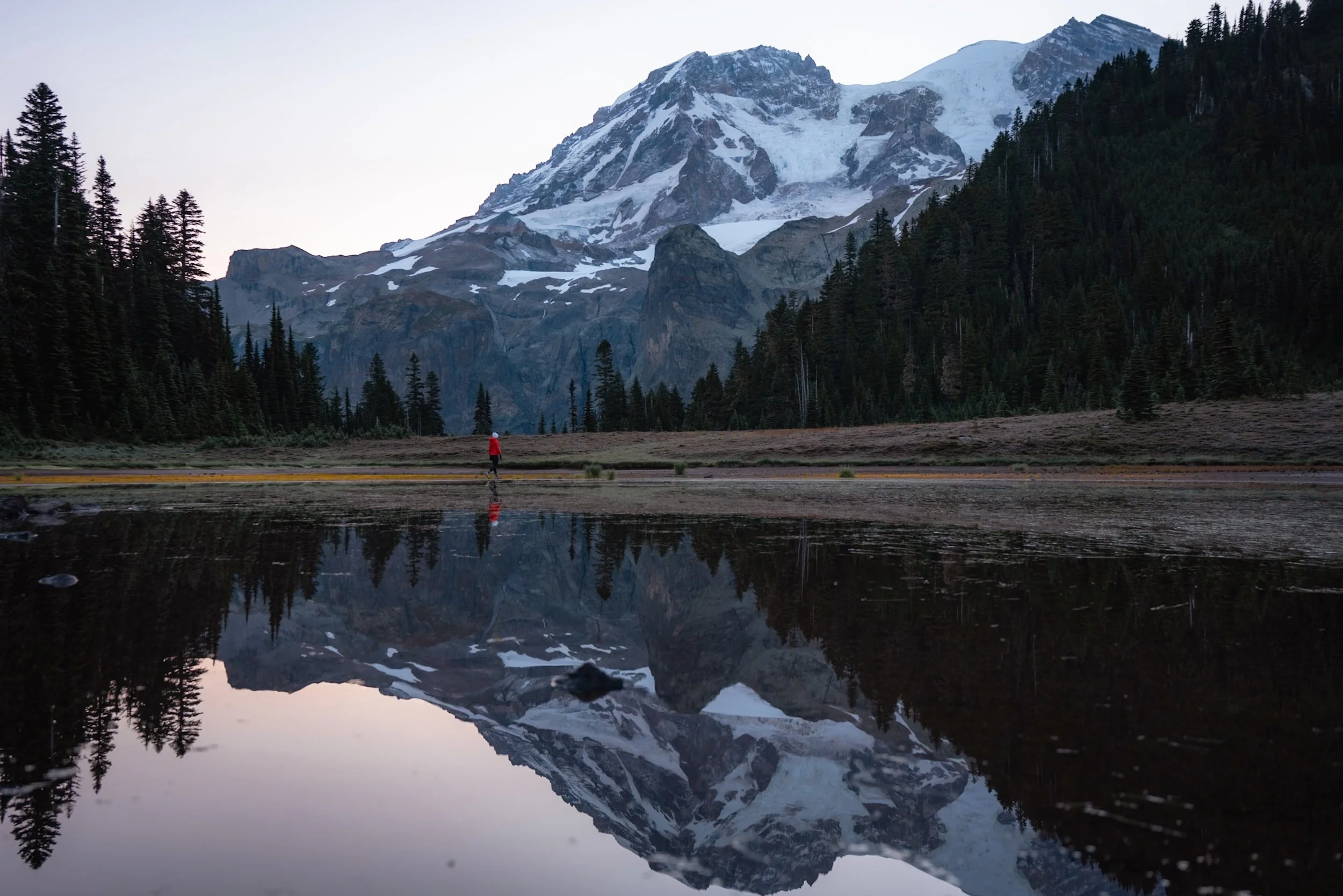 I woke up to perfectly clear skies and quickly made my way to Aurora Lake to catch the sunrise. I was absolutely stunned by how massive Mount Rainier was, perfectly reflecting on the still water of the lake. It was really cold (Klapatche Park is the highest elevation campsite I stayed at, about 6,000 ft). I took a ton of photos and made coffee while enjoying the views by the lake. As the sun crested over the ridge, it warmed me up immediately.