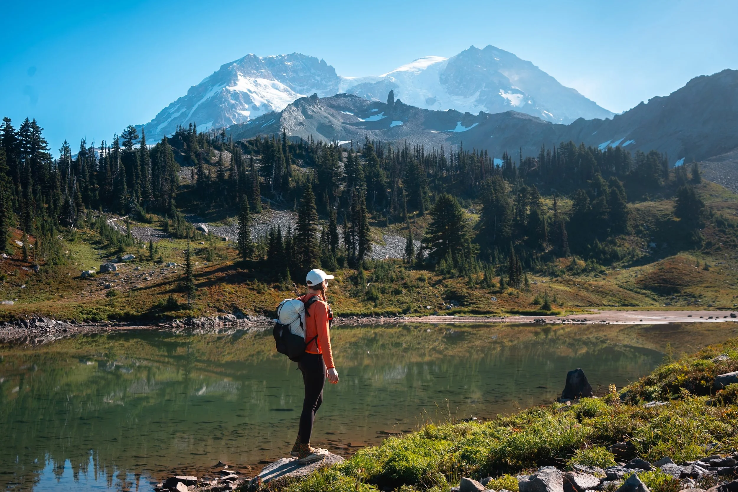 St. Andrews Lake on the Wonderland Trail, Gear in photo: backpack, leggings, sun hoodie, hat, hiking shoes